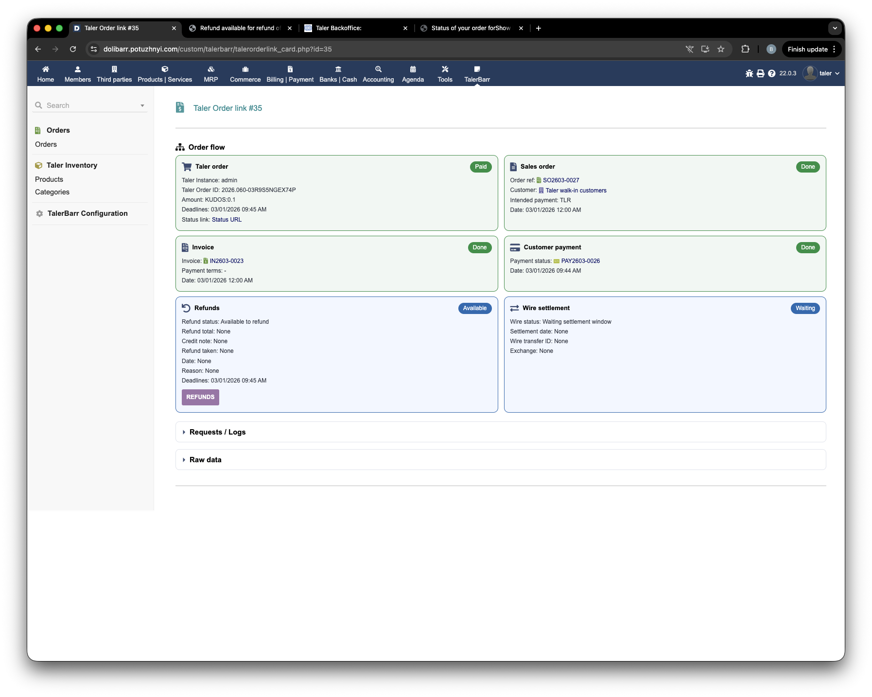 Wire transfer handling is the final settlement step in the full TalerBarr order flow. After an order has been paid, and after any refund deadlines and wire deadlines have been processed, TalerBarr can track the settlement information and link it back to the corresponding Dolibarr-side transfer objects.