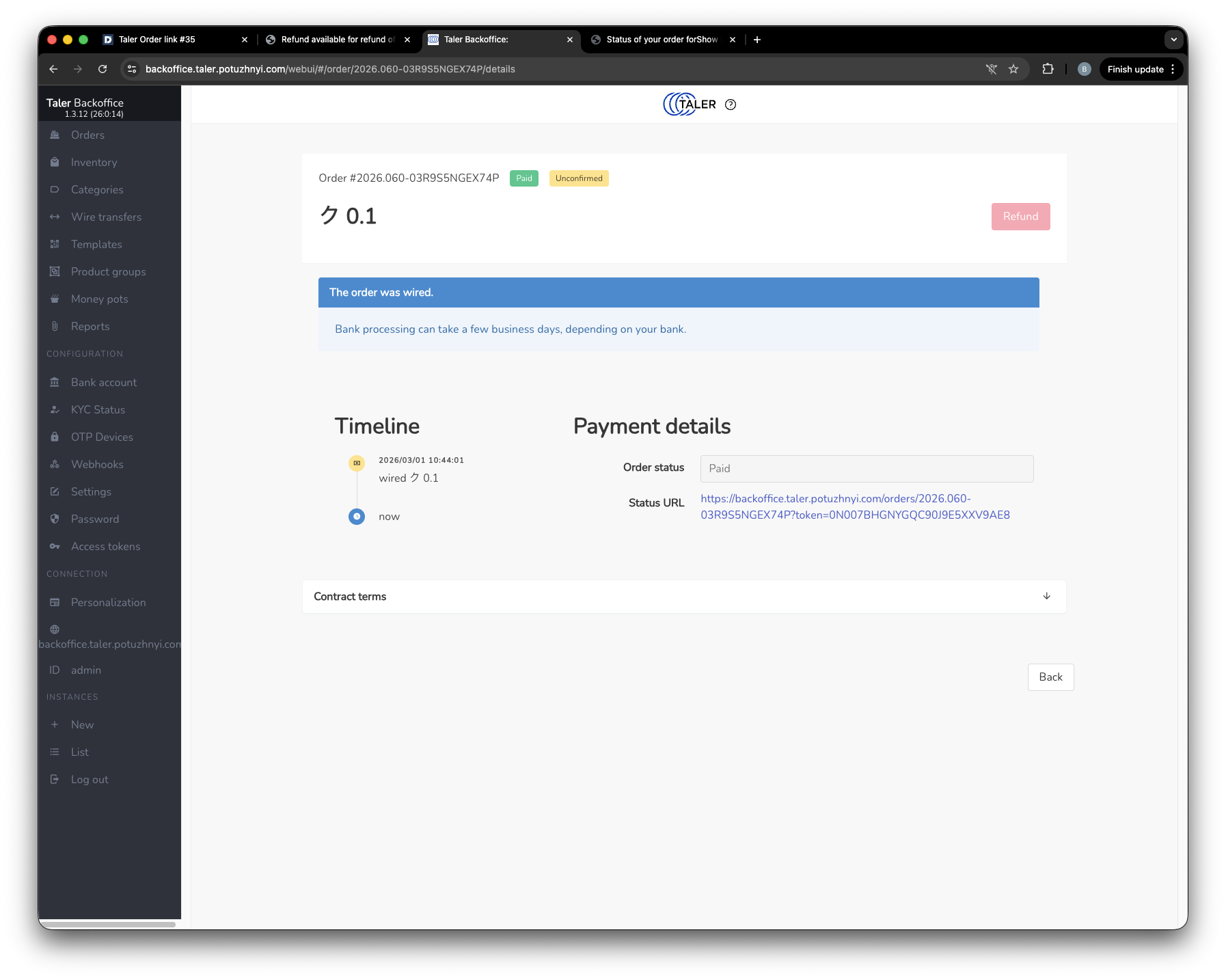 After the order is created and paid, you can first verify on the TalerBarr order card that the payment information is already present. At this point, the payment has succeeded, but the wire transfer is not yet created.