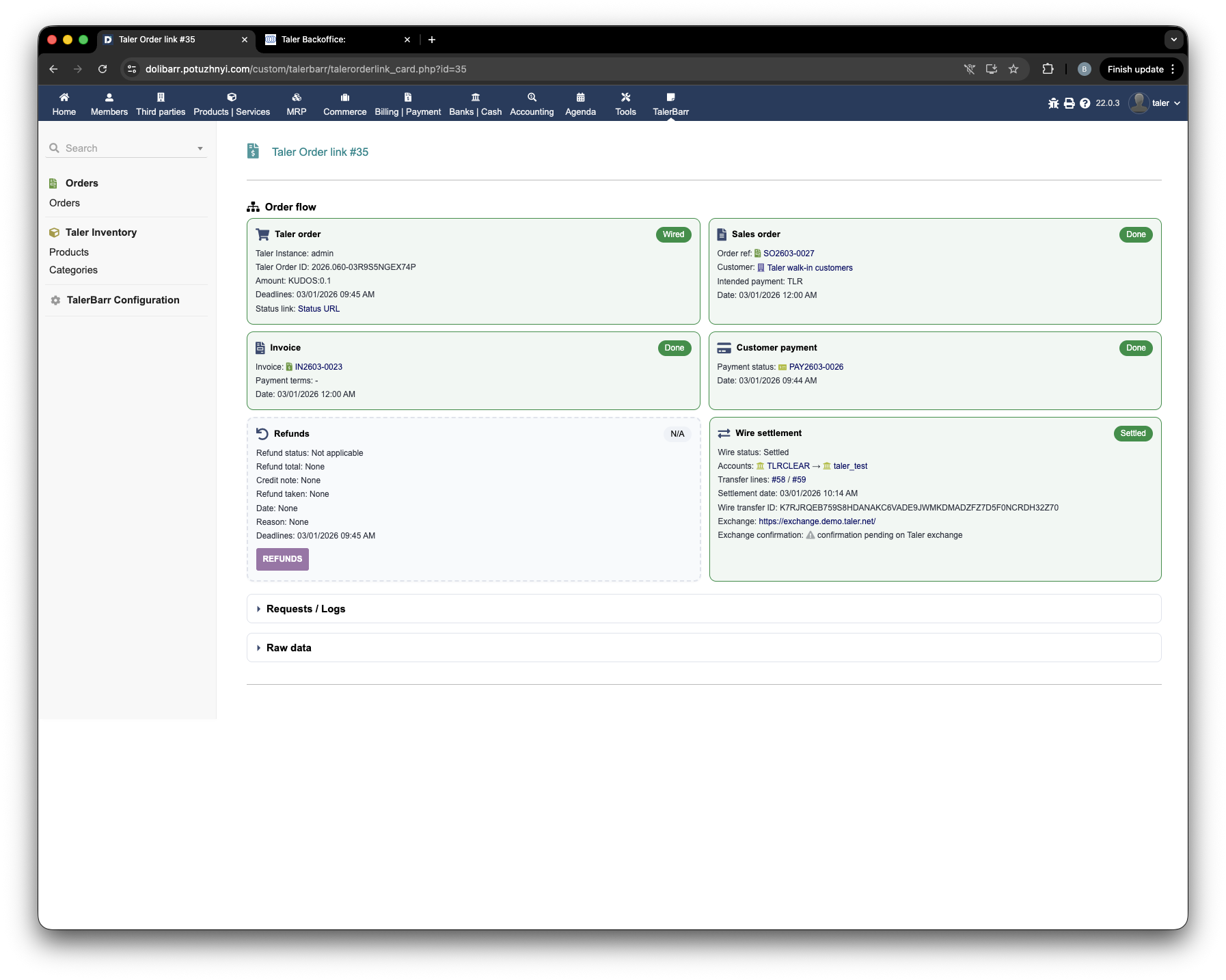 Once wire transfer information is linked, the TalerBarr order record represents the complete path from order creation to settlement. At that point the Dolibarr side has a documented payment trail that includes: