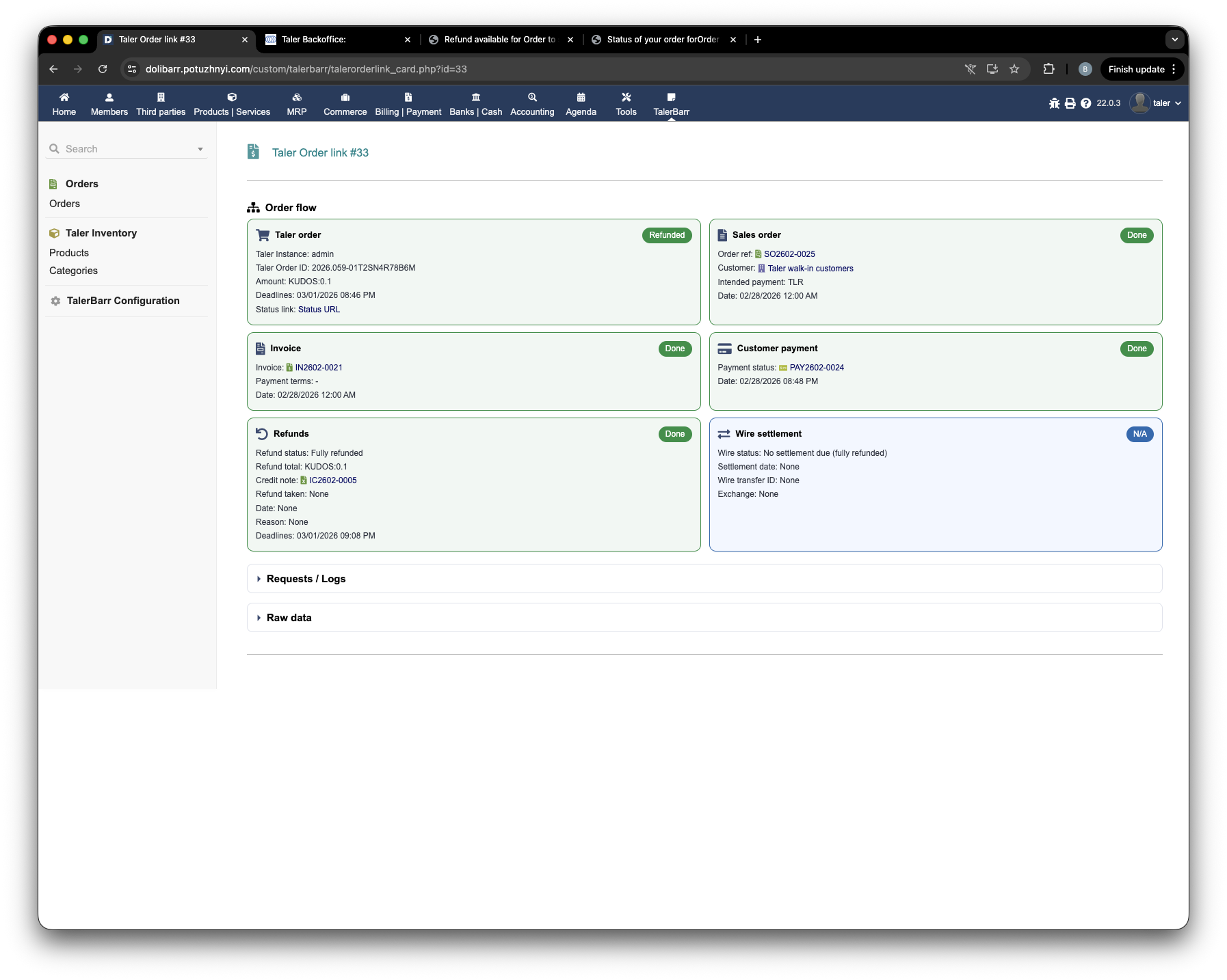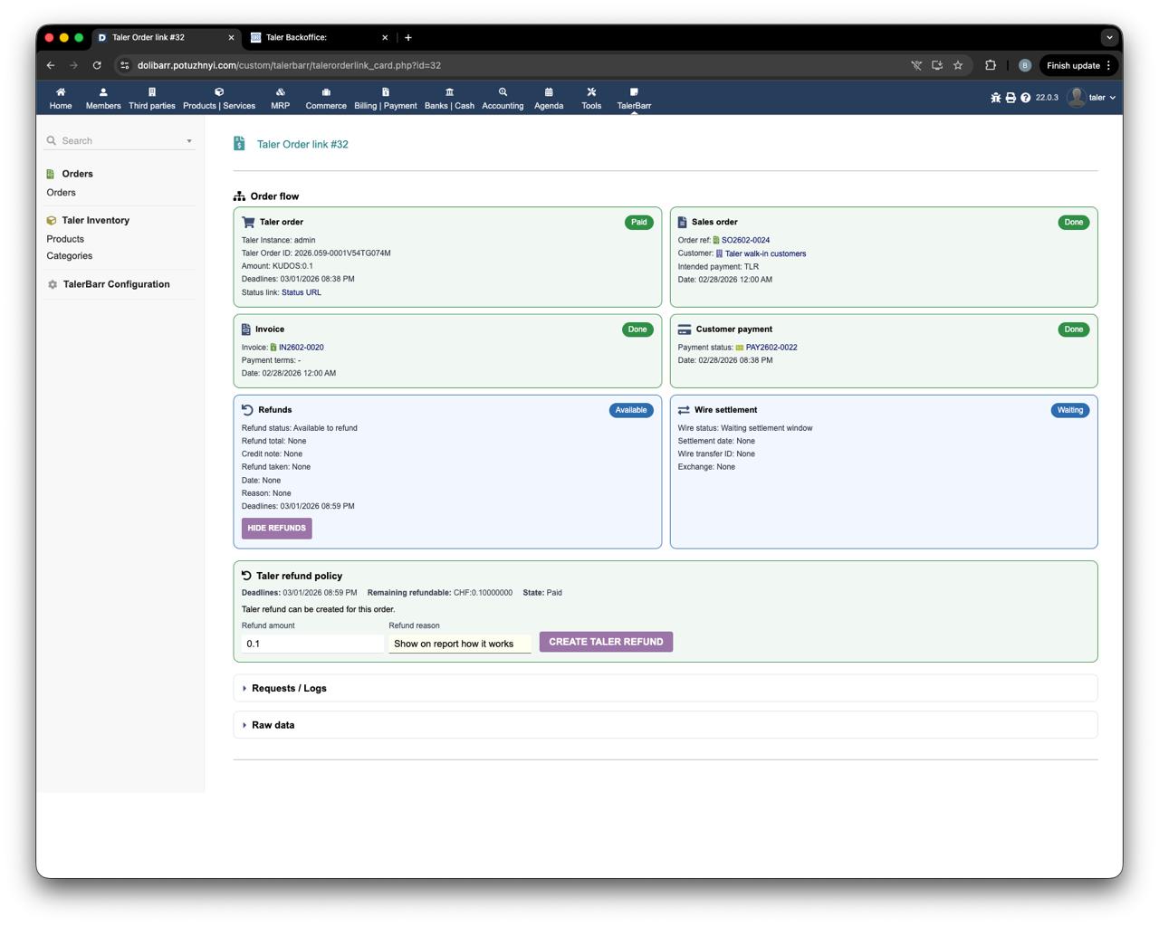 After that, you can return to Dolibarr and see on the TalerBarr order card that the refund is now in progress.