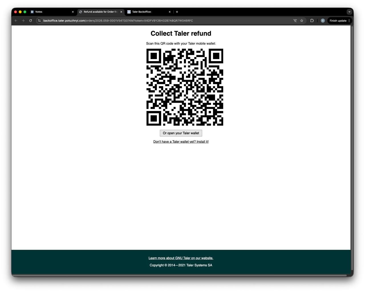 The customer can then collect the refund with a Taler wallet.