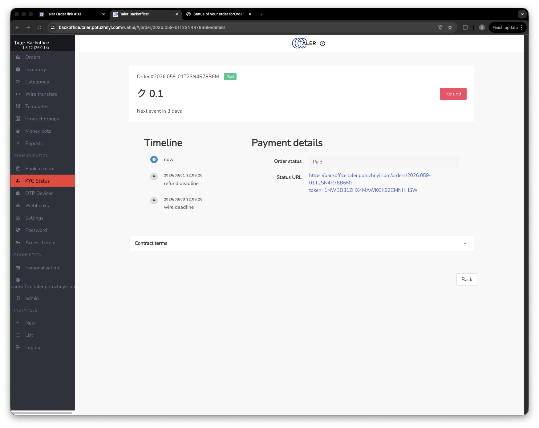 After the wallet collects the refund, the status is updated first on the Taler side and then on the Dolibarr side as well.