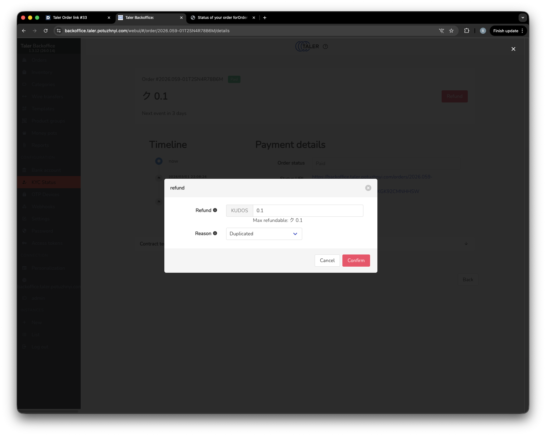 Paid order before starting the refund from Taler SPAA.#