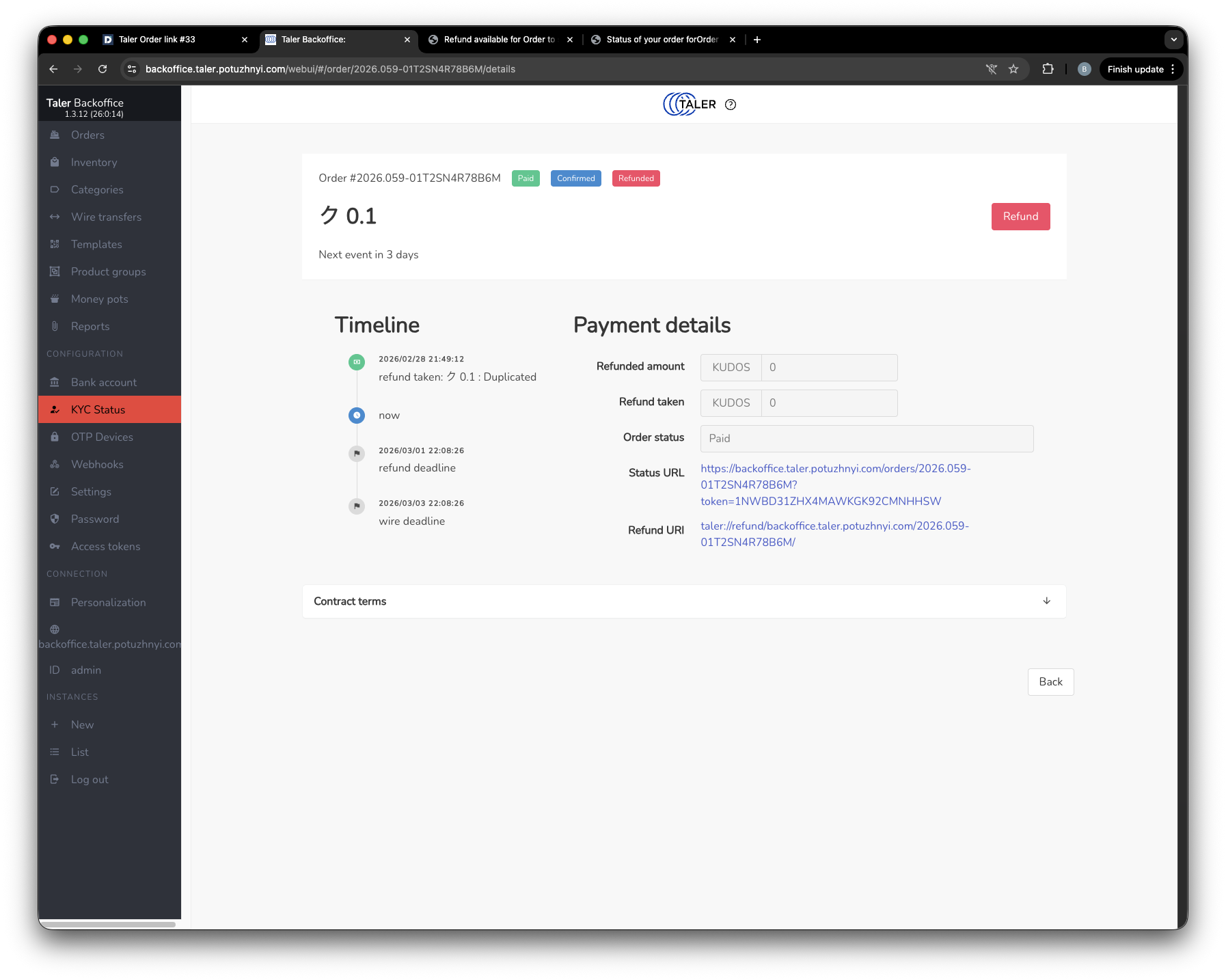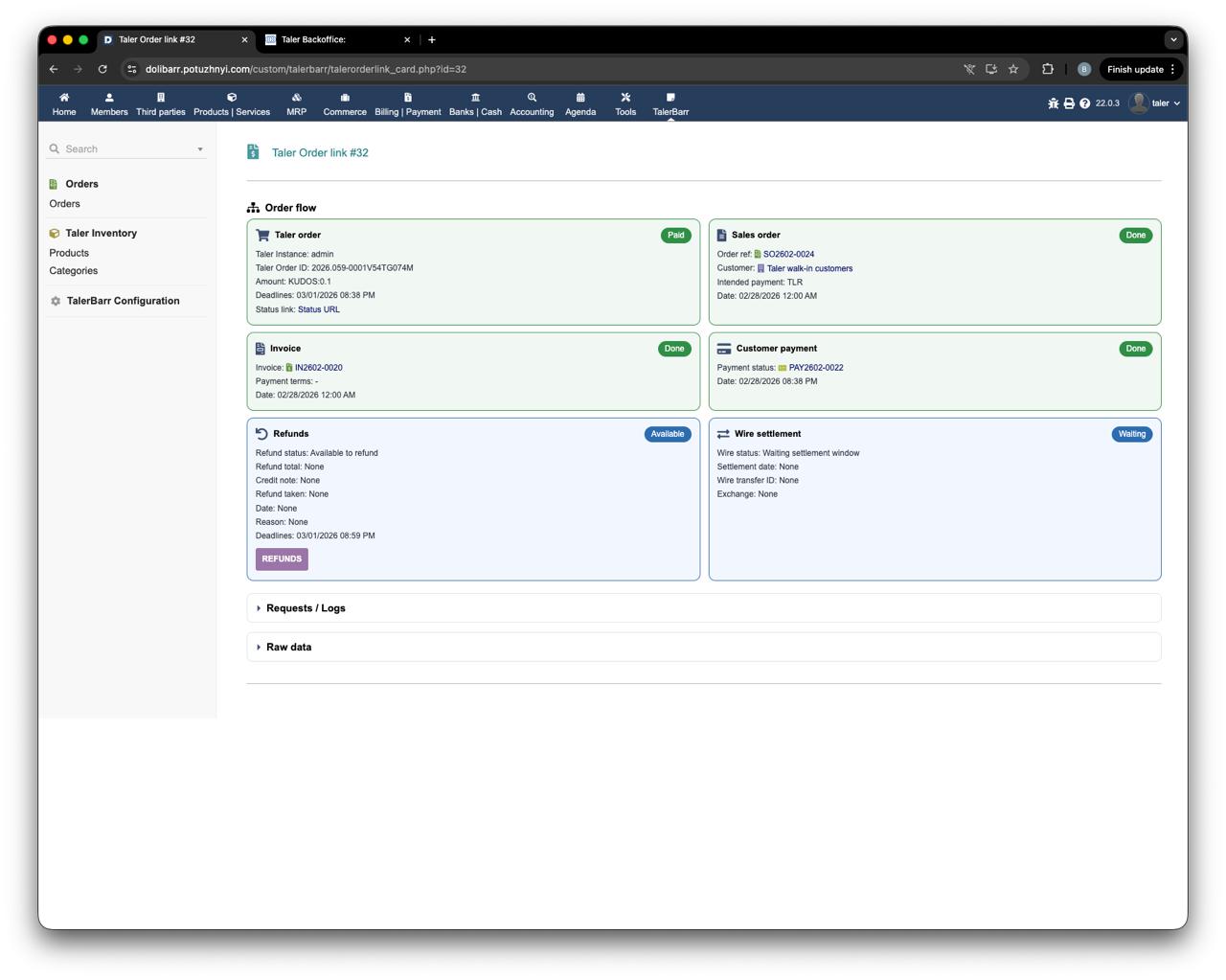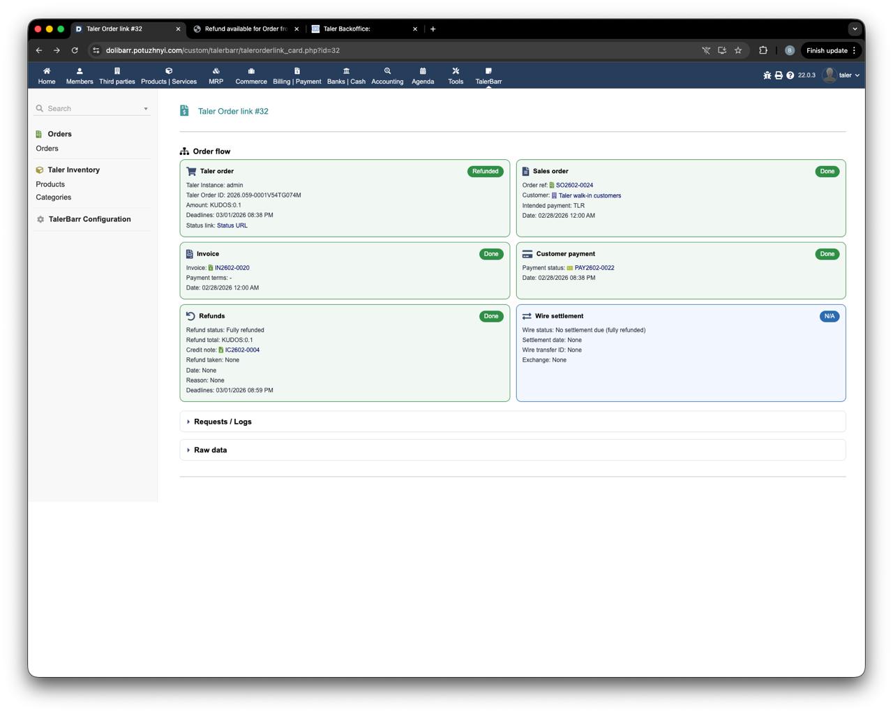 After the wallet collects the refund, the status is updated first on the Taler side and then on the Dolibarr side as well.