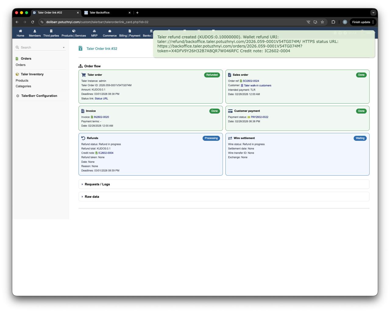 After validation, TalerBarr checks that the refund conditions are still valid and creates the refund on the Taler side. A note is then added to the credit note, and the TalerBarr order card also shows that the refund is in progress.