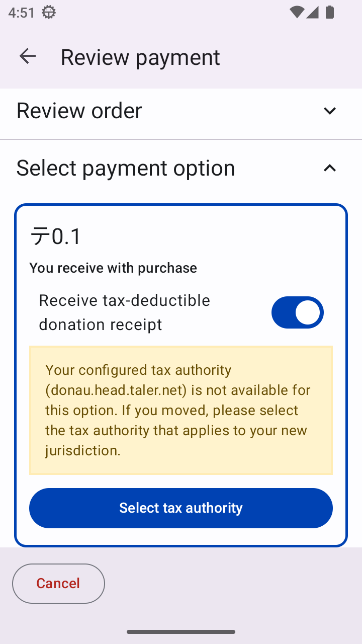 Configure a donation authority that supports this payment – press Select tax authority button to set it up and input tax payer ID.