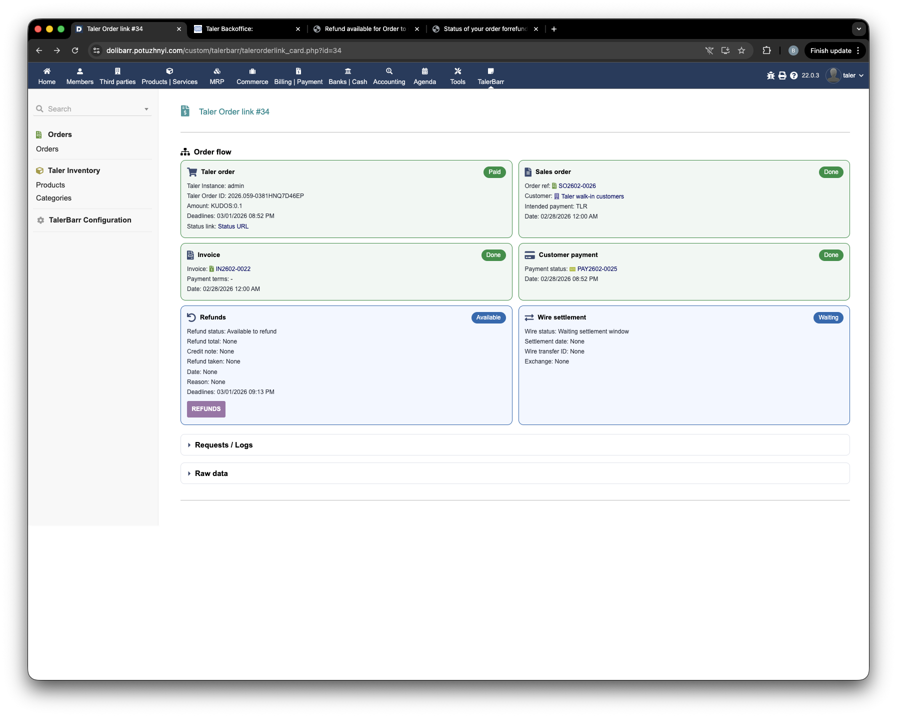 After the wallet collects the refund, the status is updated first on the Taler side and then on the Dolibarr side as well.