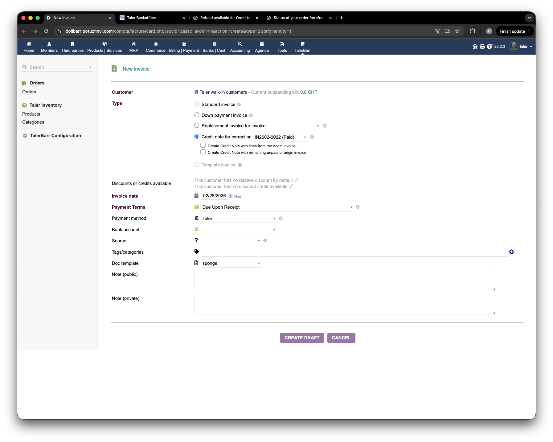 Creating a Dolibarr credit note with Taler as the payment method.#