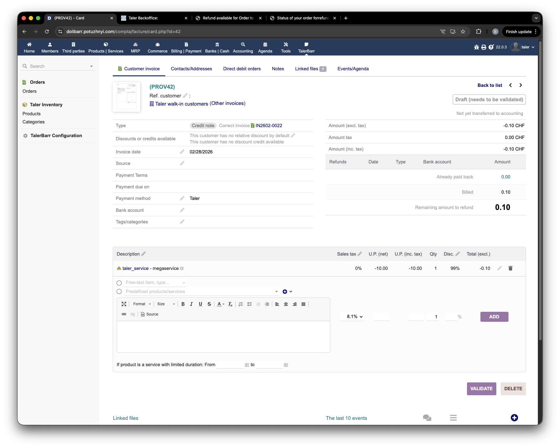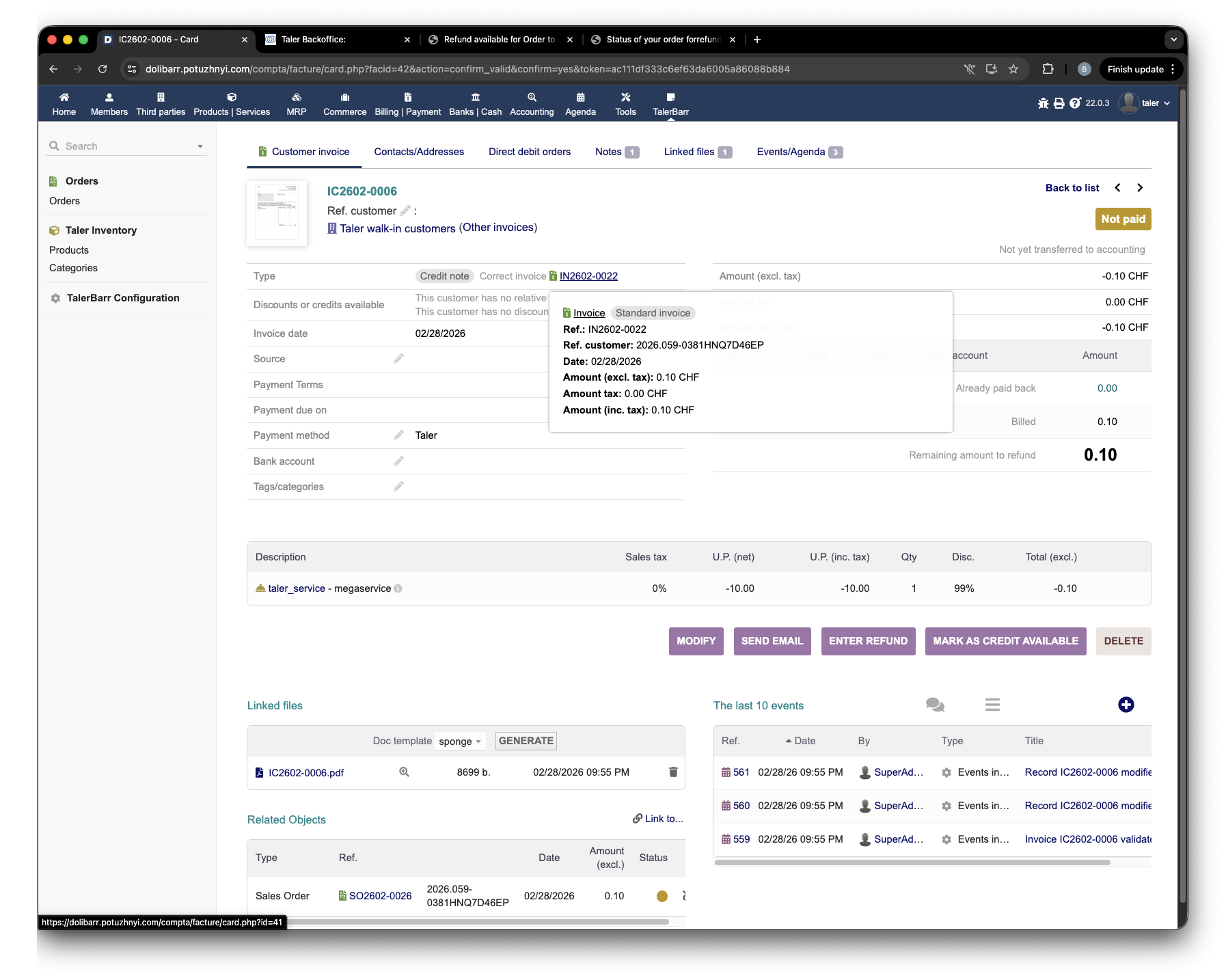 After that, you can return to Dolibarr and see on the TalerBarr order card that the refund is now in progress.