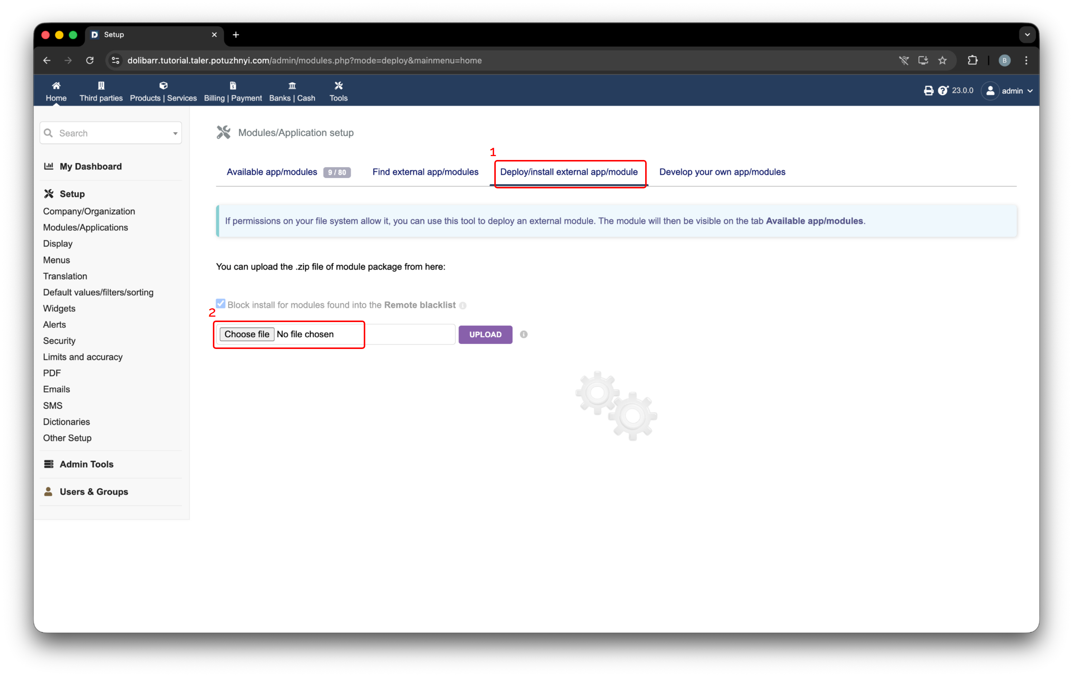 To do this, open your Dolibarr instance, log in as an administrator, and make sure the required modules are enabled. From the home page, click Setup in the left sidebar, then open Setup -> Modules/Applications as shown in the figure below.