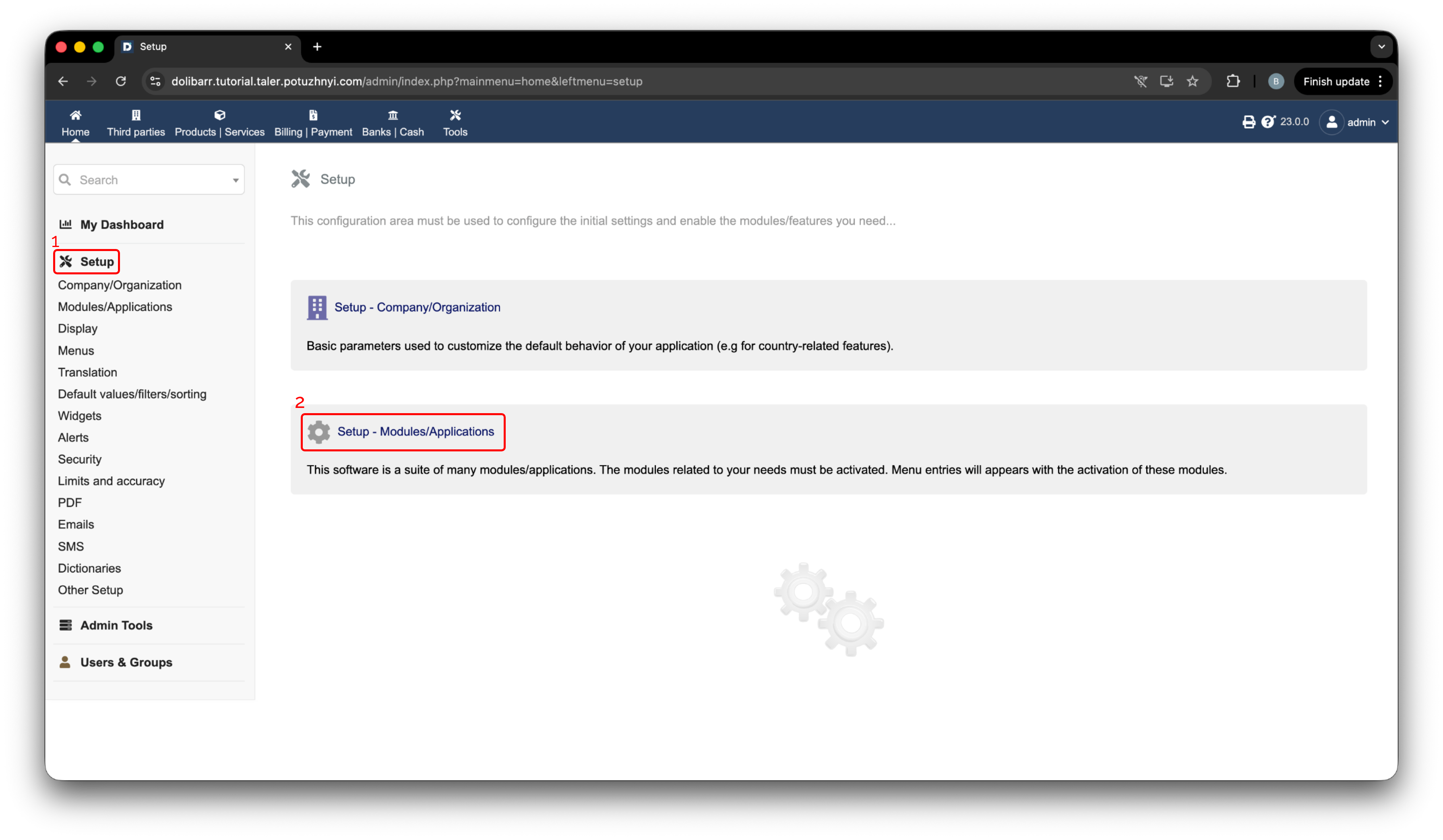 To do this, open your Dolibarr instance, log in as an administrator, and make sure the required modules are enabled. From the home page, click Setup in the left sidebar, then open Setup -> Modules/Applications as shown in the figure below.
