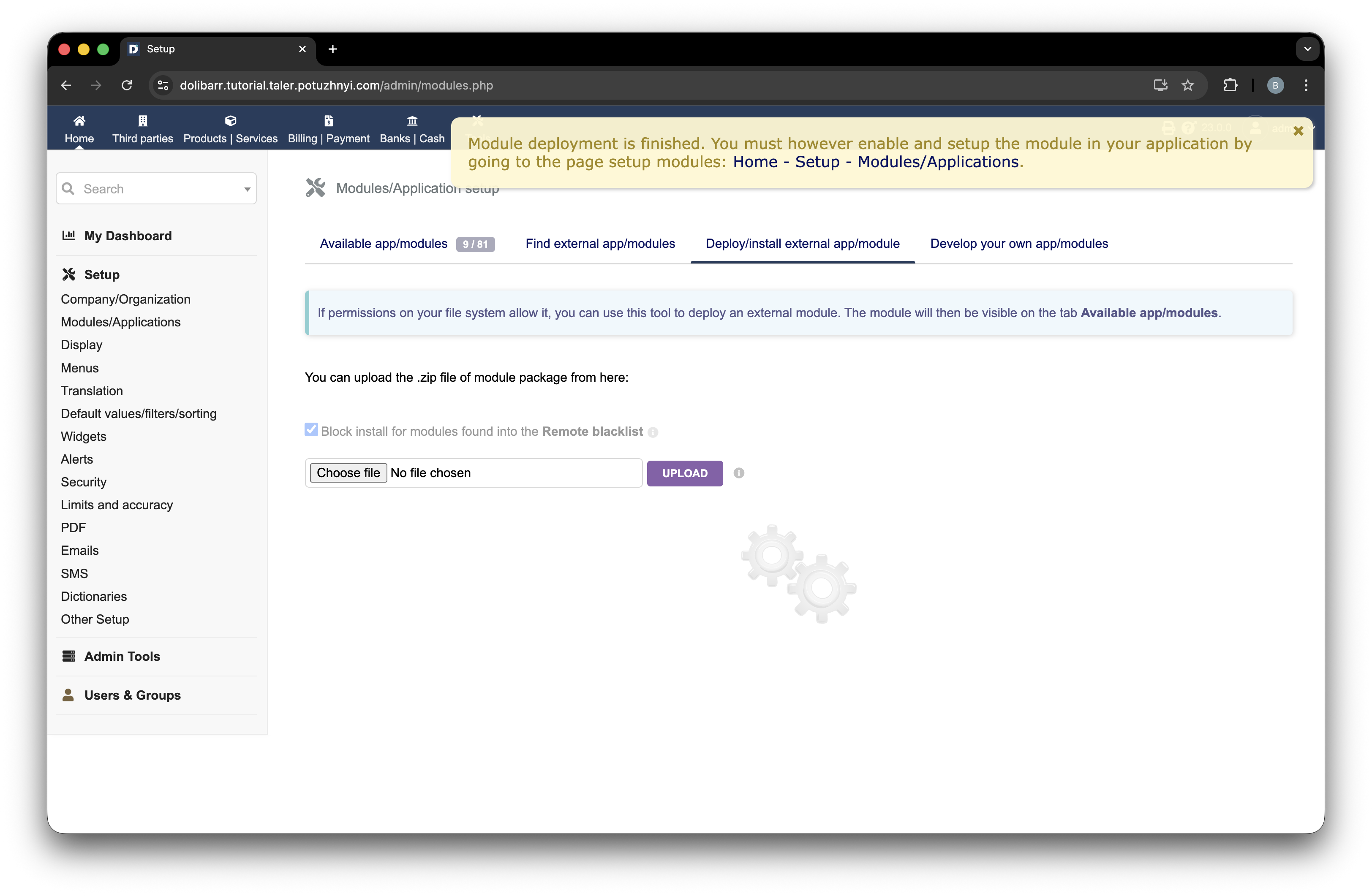 Once the file is selected, it is shown in the upload form. Press Upload to install the module. After a successful upload, a confirmation message appears in the top-right corner.